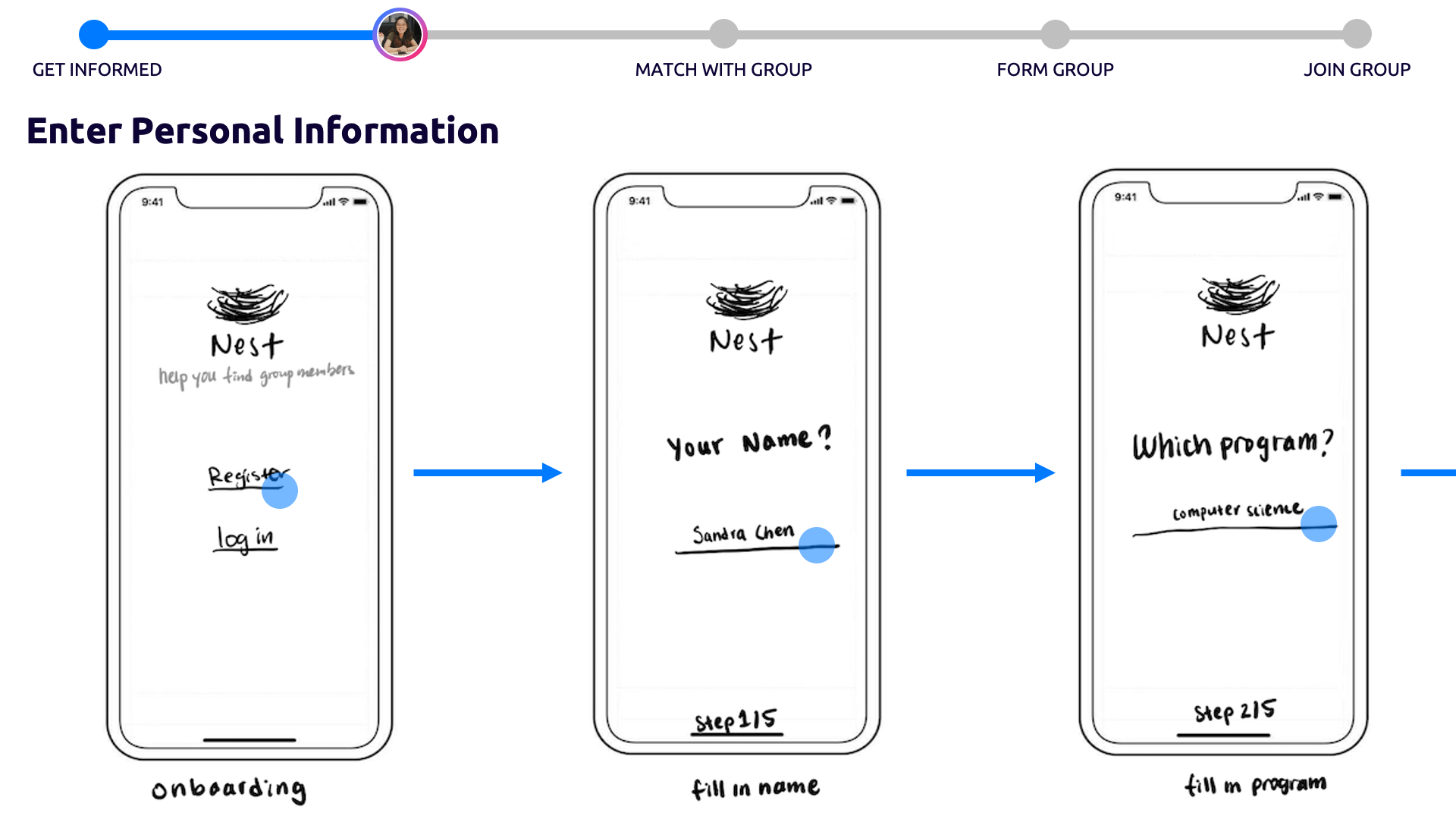 Nest is an all-in-one group forming platform. Nest gives students a fun way to introduce themselves to other students and get to know their unique traits and schedules. The platform will then help students match and form groups for their academic projects through various tools such as a group chat messaging and scheduling a meeting. The project was created for The Innovation Hub through the ‘Fundamentals of UX’ course at the University of Toronto.