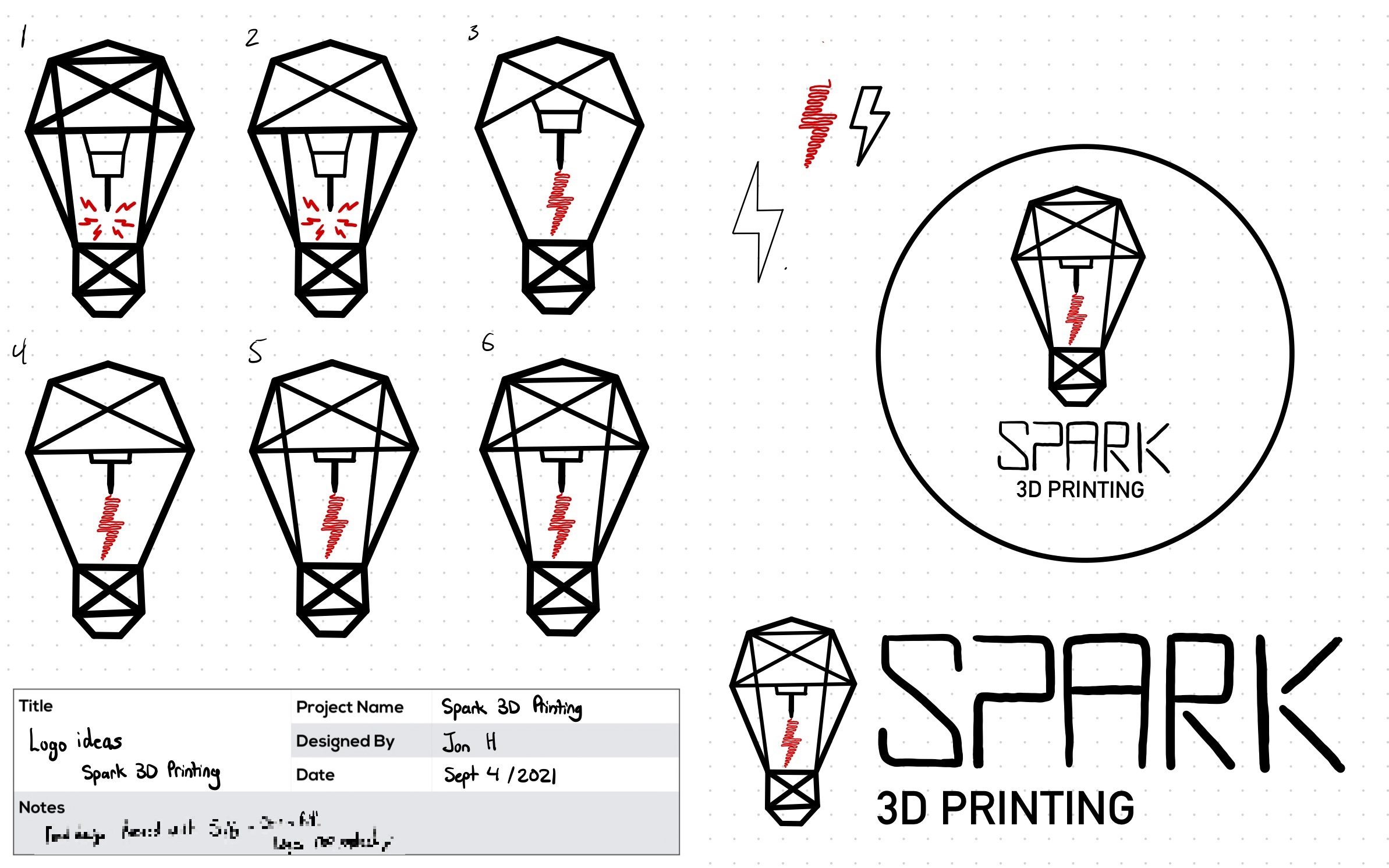 We decided to incorporate all the core elements from the previous designs into a new modernized logo. For the font-face, we went with a rectangular typeface design that resembles similar to a digital font. For the logo mark, we kept the lightbulb that is consistent with the previous designs and created a prismatic design to match the modernized revamp of the new logo. We added the lightning graphic inside the lightbulb to signify the “spark” of the name and the business. Additionally, the fill of the lightning bolt is done as a line design to resemble the filament used for 3D printing and we include a filament extruder above to signify we’re “printing an idea”.